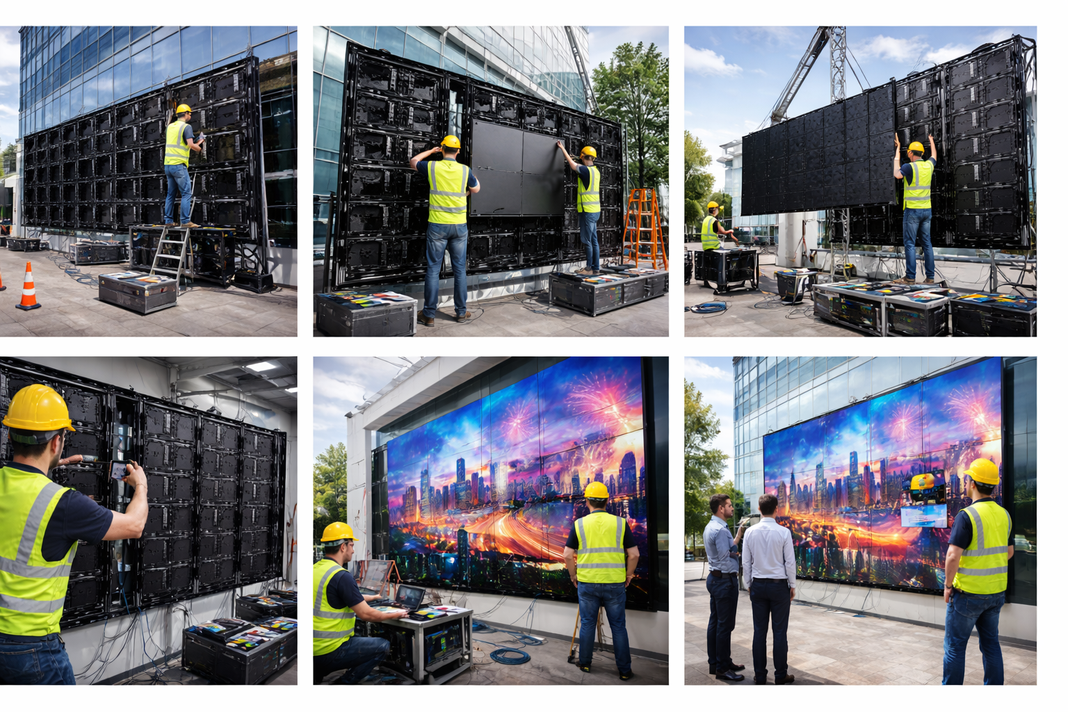 After the design is finalized, technicians install the mounting structure and secure the display panels in place. Precise alignment is important to maintain a uniform appearance.